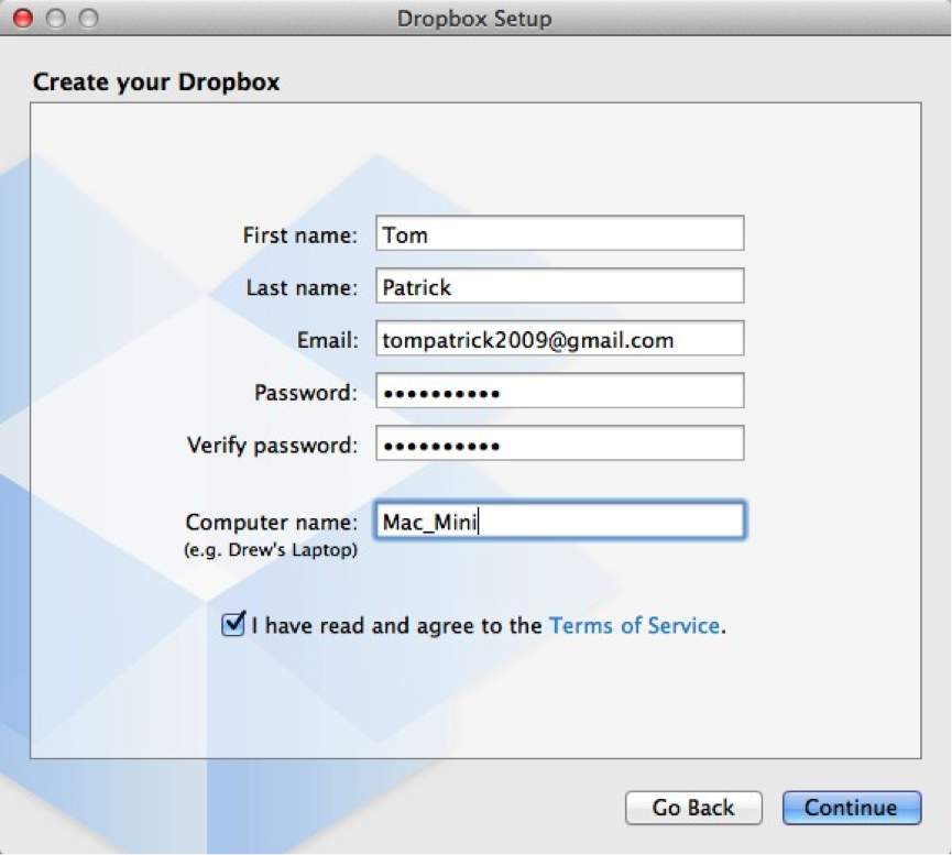 - Agree to terms and click Continue. Select 2GB (Free) account to store your future files on Dropbox. Now click series of Continues to finalize the process.